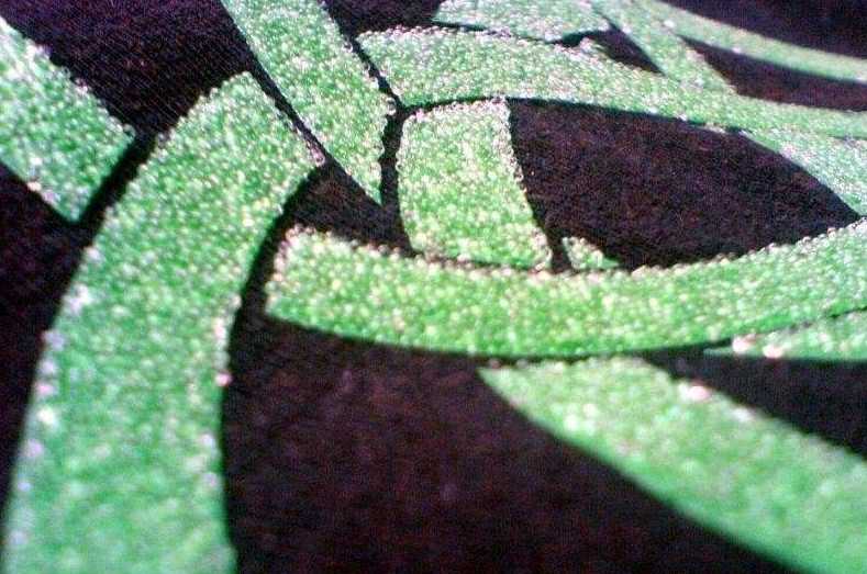 將粘珠漿印于布上趁濕灑上塑膠珠,160度烘干或用壓燙機150~160度壓8~15秒即可。